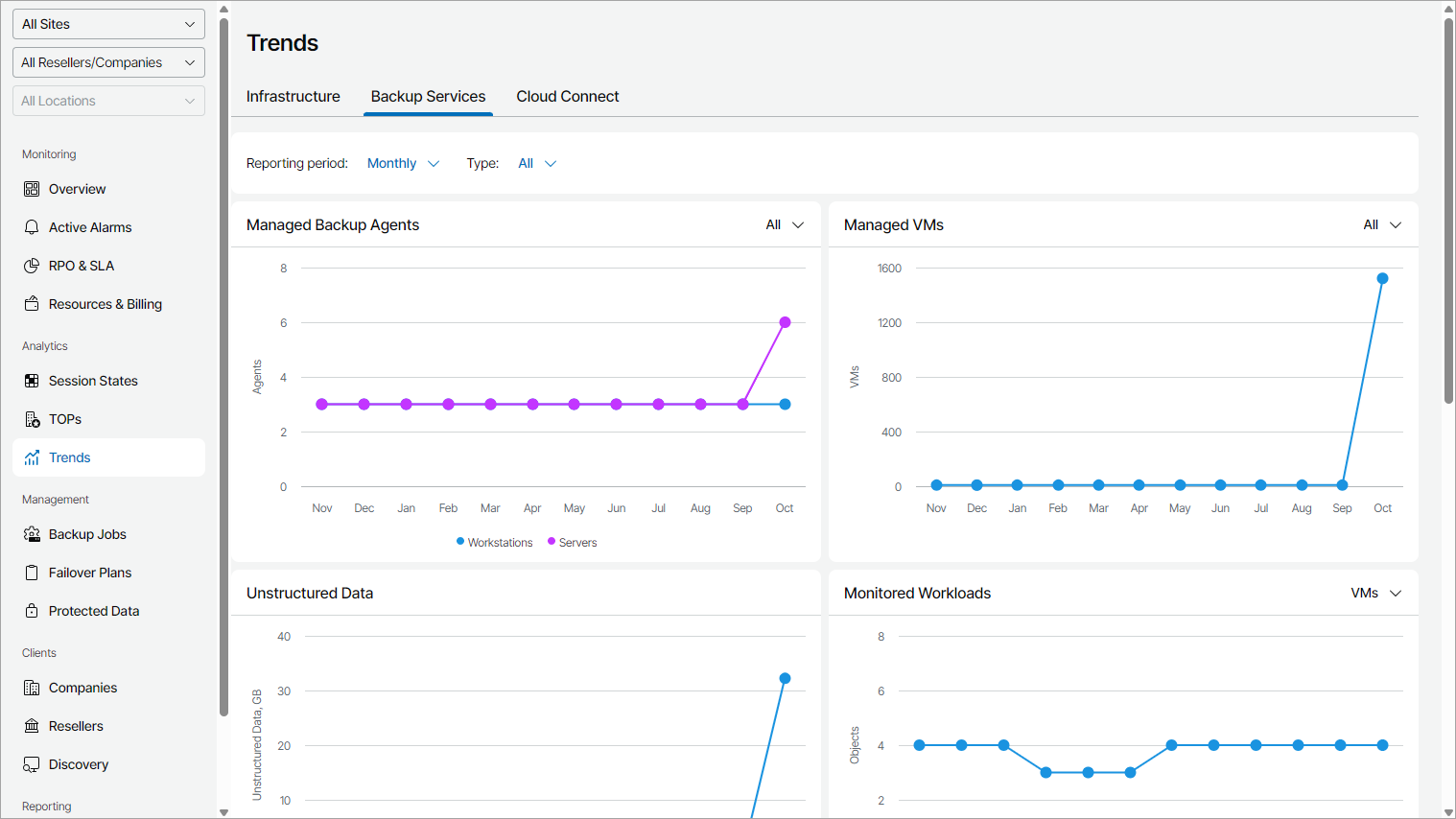 - Unstructured Data widget shows how the amount of protected data on managed file shares and object storage has been changing during the reporting period. The widget shows the total size of protected files and the size of protected backup and archive files.
