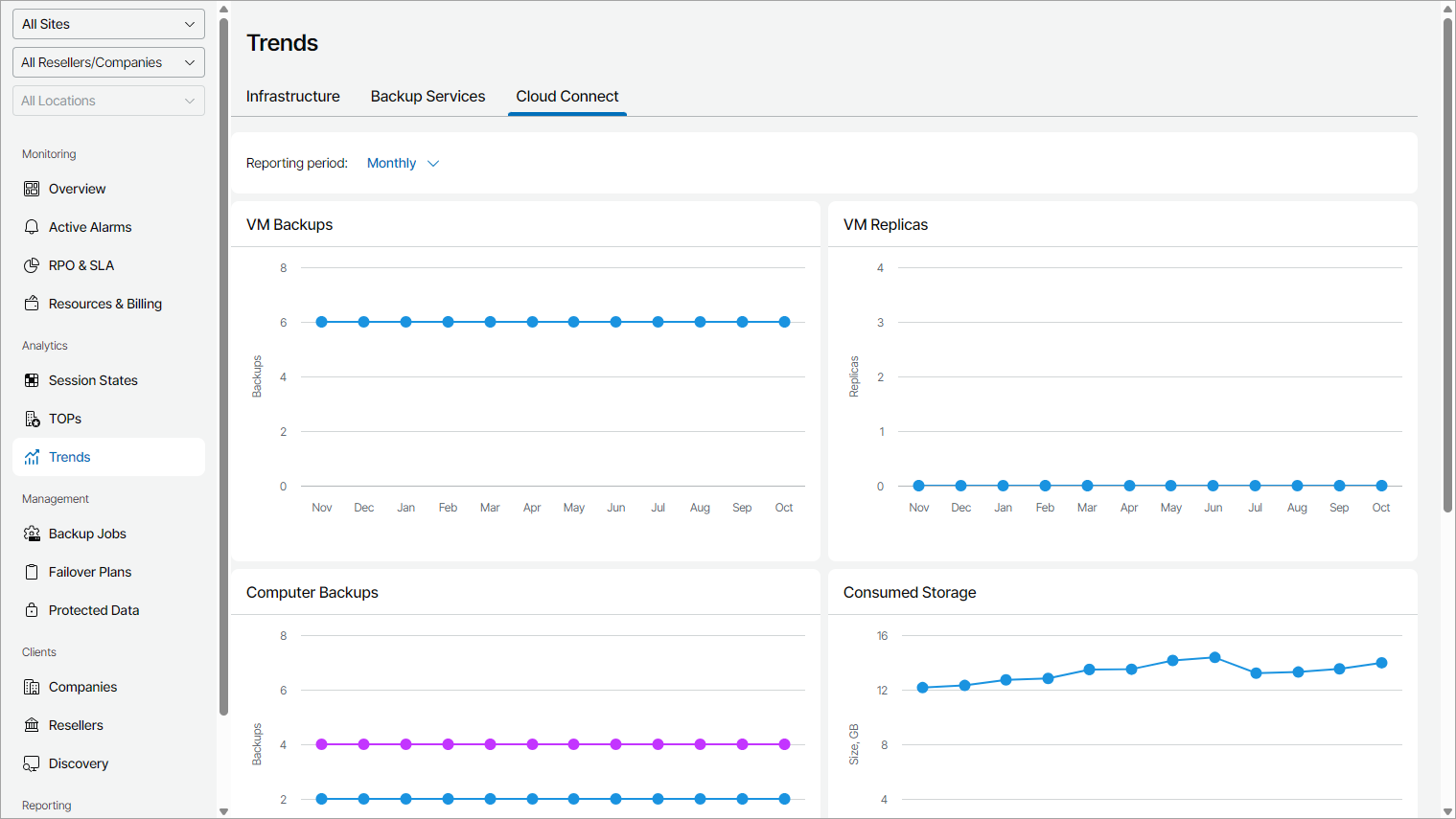 • VM Backups widget shows how the number of VMs backed up to cloud repositories has been changing during the reporting period.