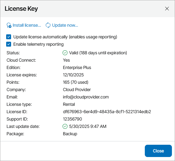 - When a new license becomes available, Veeam Service Provider Console automatically downloads and installs it to replace the old license.
