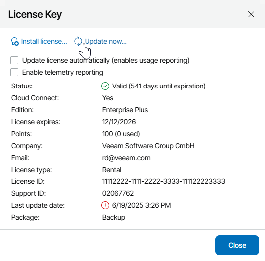 - In the License Key window, click Update now.