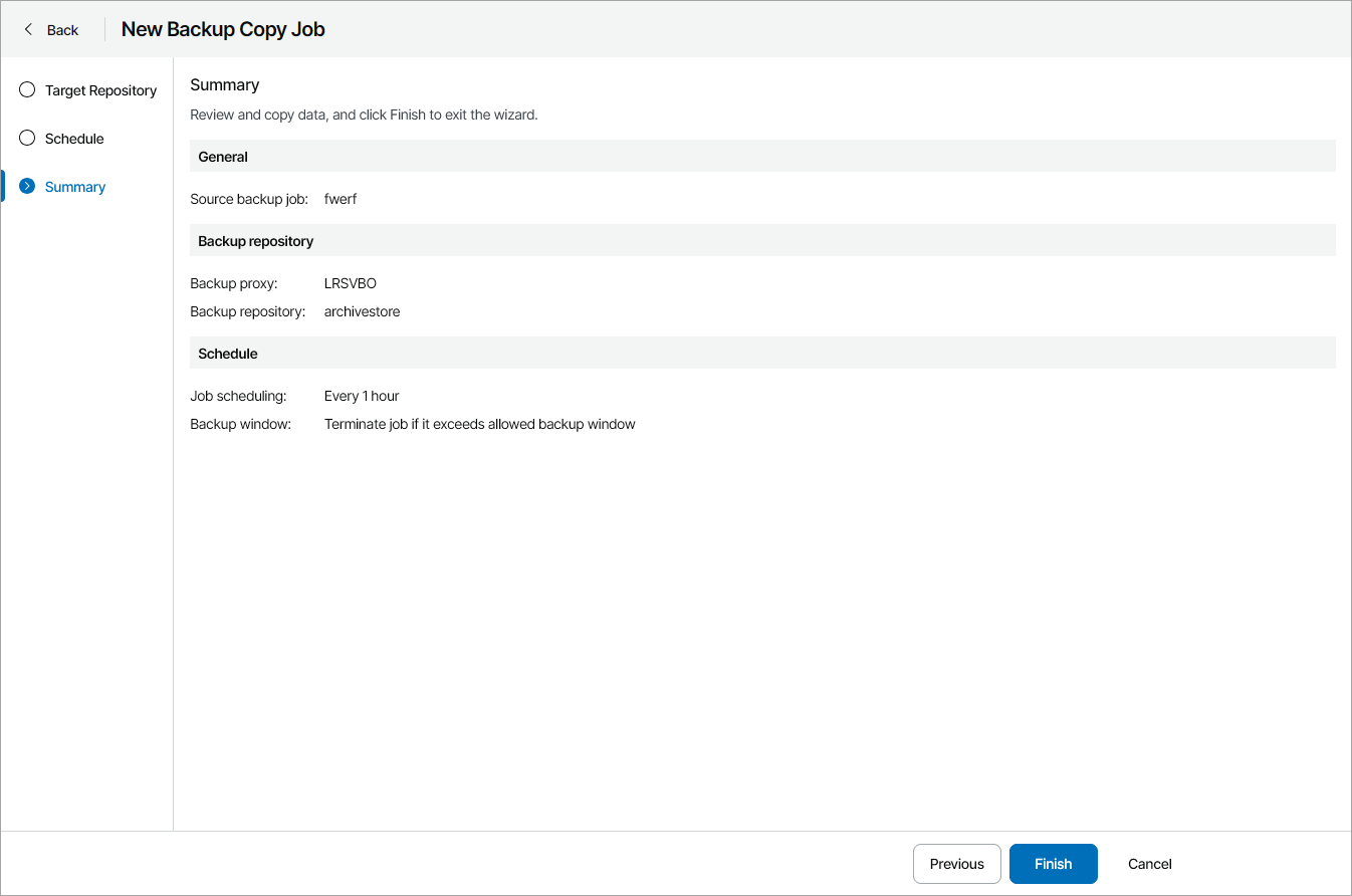 This is an archive version of the document. To get the most up-to-date information, see the current version. Step 4. Review Backup Copy Job Settings At the Summary step of the wizard, review the configured backup copy job settings and click Finish.