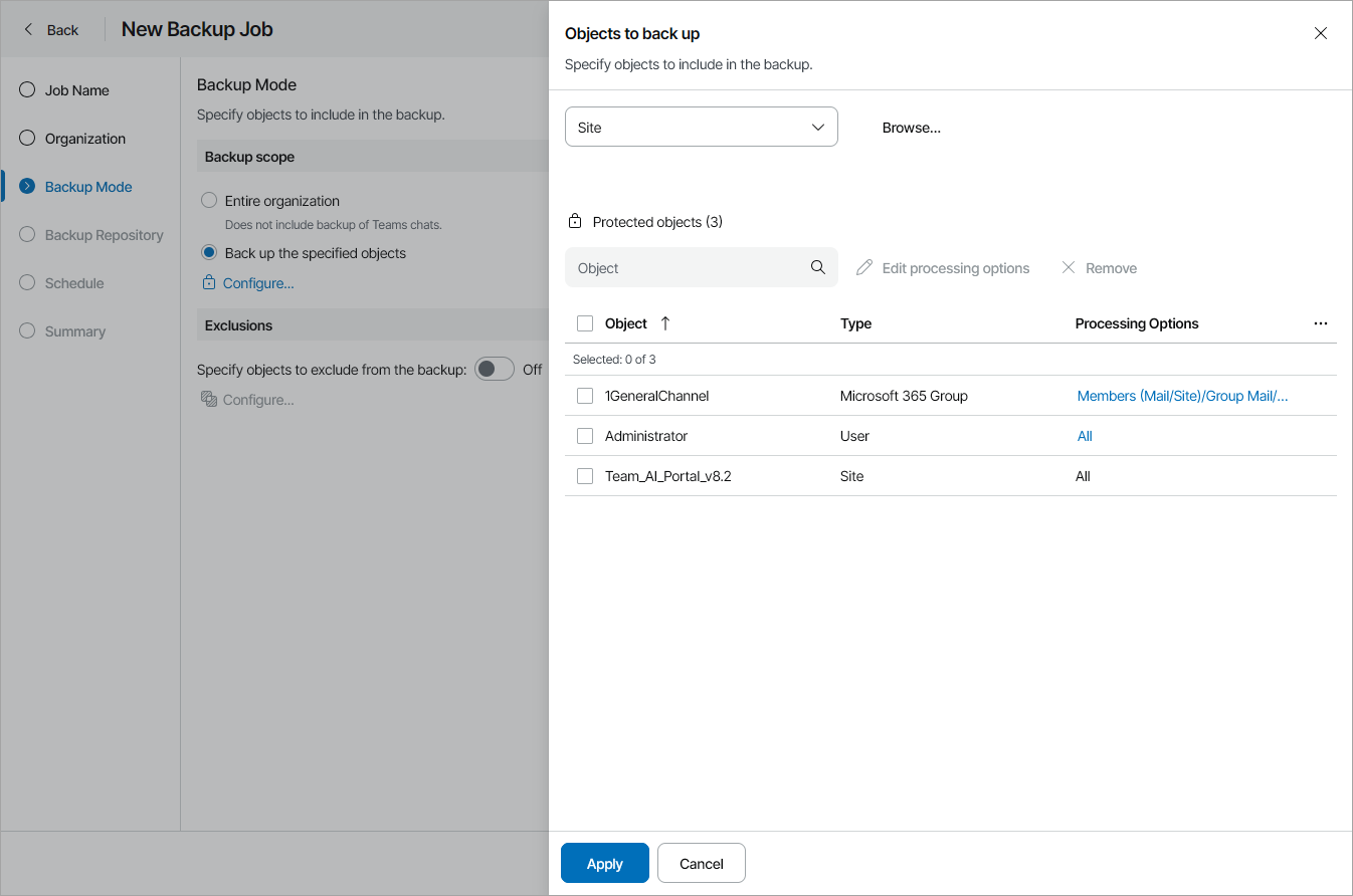 For details about available object types and their processing options, see section Organization Object Types of the Veeam Backup for Microsoft 365 User Guide.