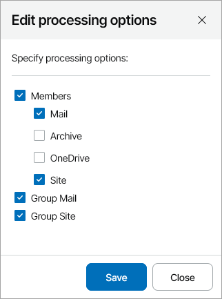 - [For User, Teams, Group and Current organization object types] In the Edit processing options window, select the necessary processing options and click Save.