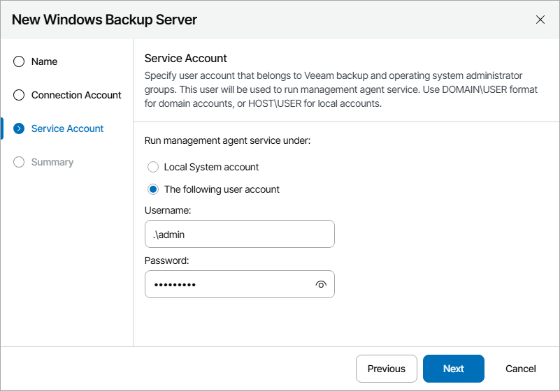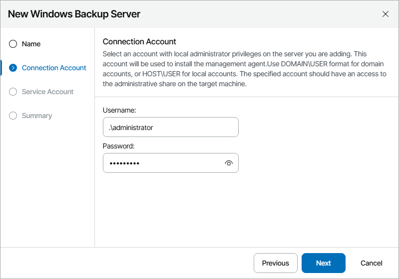 - At the Connection Account step of the wizard, specify credentials of a user account with local Administrator privileges on the Veeam Backup & Replication server.