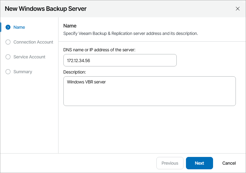 To configure a connection to the Windows Veeam Backup & Replication server: