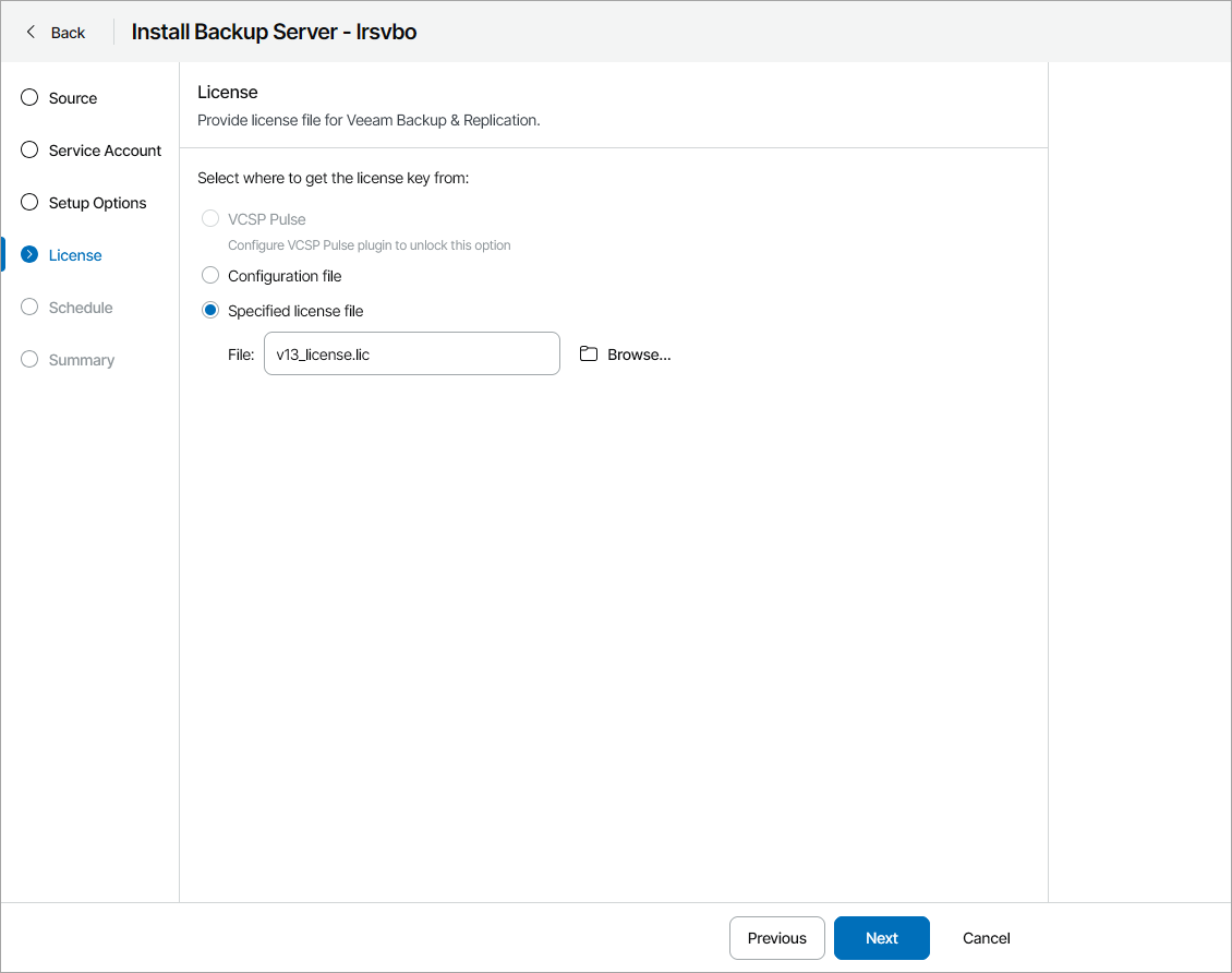 - VBR_LICENSE_FILE — path to the license file on the machine where you want to install Veeam Backup & Replication. If you want to install VCSP Pulse license or provide the license file manually, leave this parameter empty.