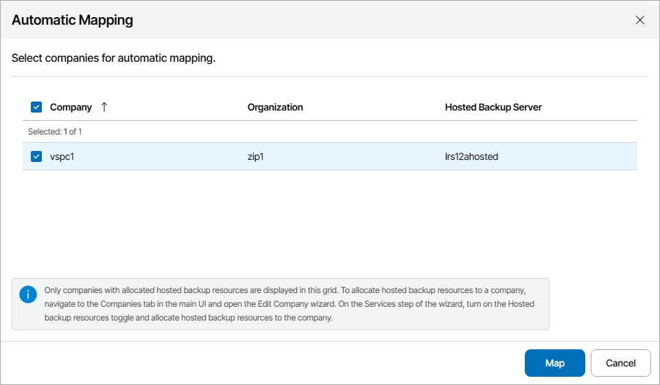 - In the Company Mapping window, type the name of Veeam Service Provider Console company which you want to map.