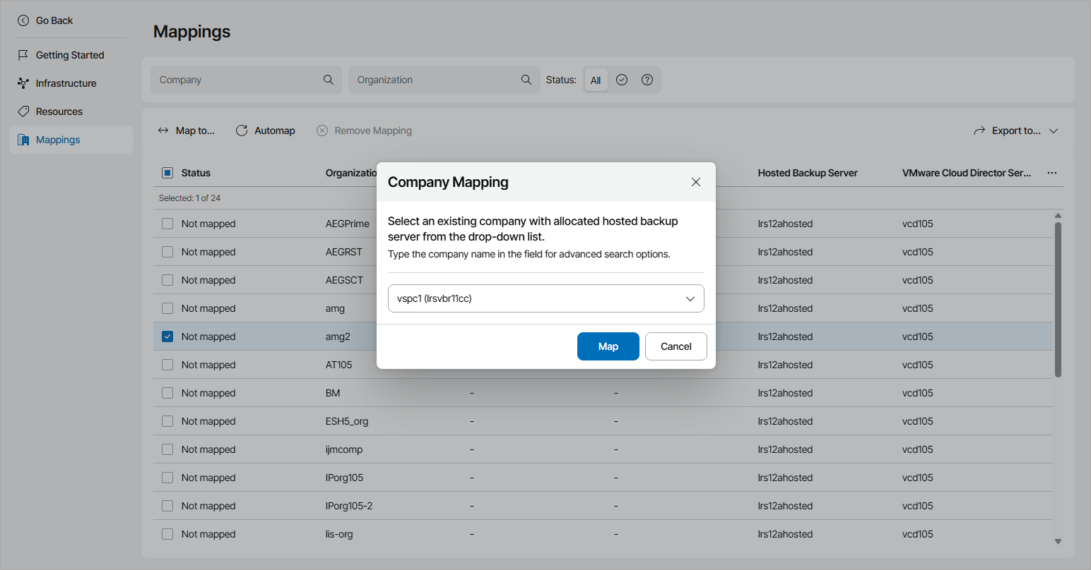 - From the list of companies, select an unmapped VMware Cloud Director organization.