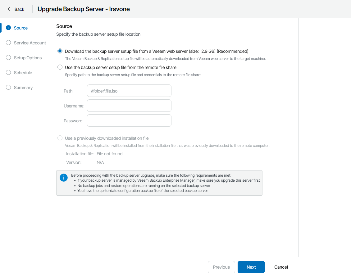 Alternatively, you can download the setup file in Veeam Service Provider Console to the remote computer in advance to decrease Veeam Backup & Replication server downtime.