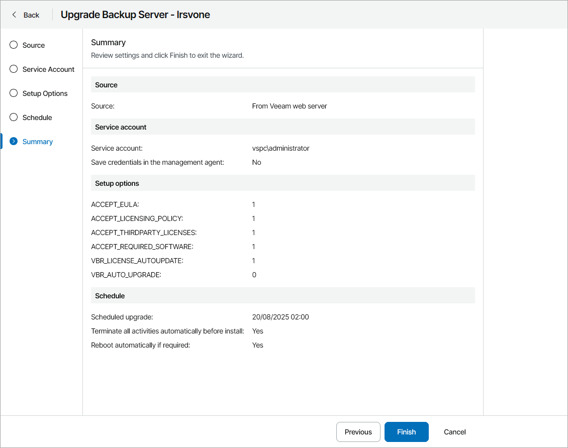 - At the Summary step of the wizard, review upgrade settings and click Finish.