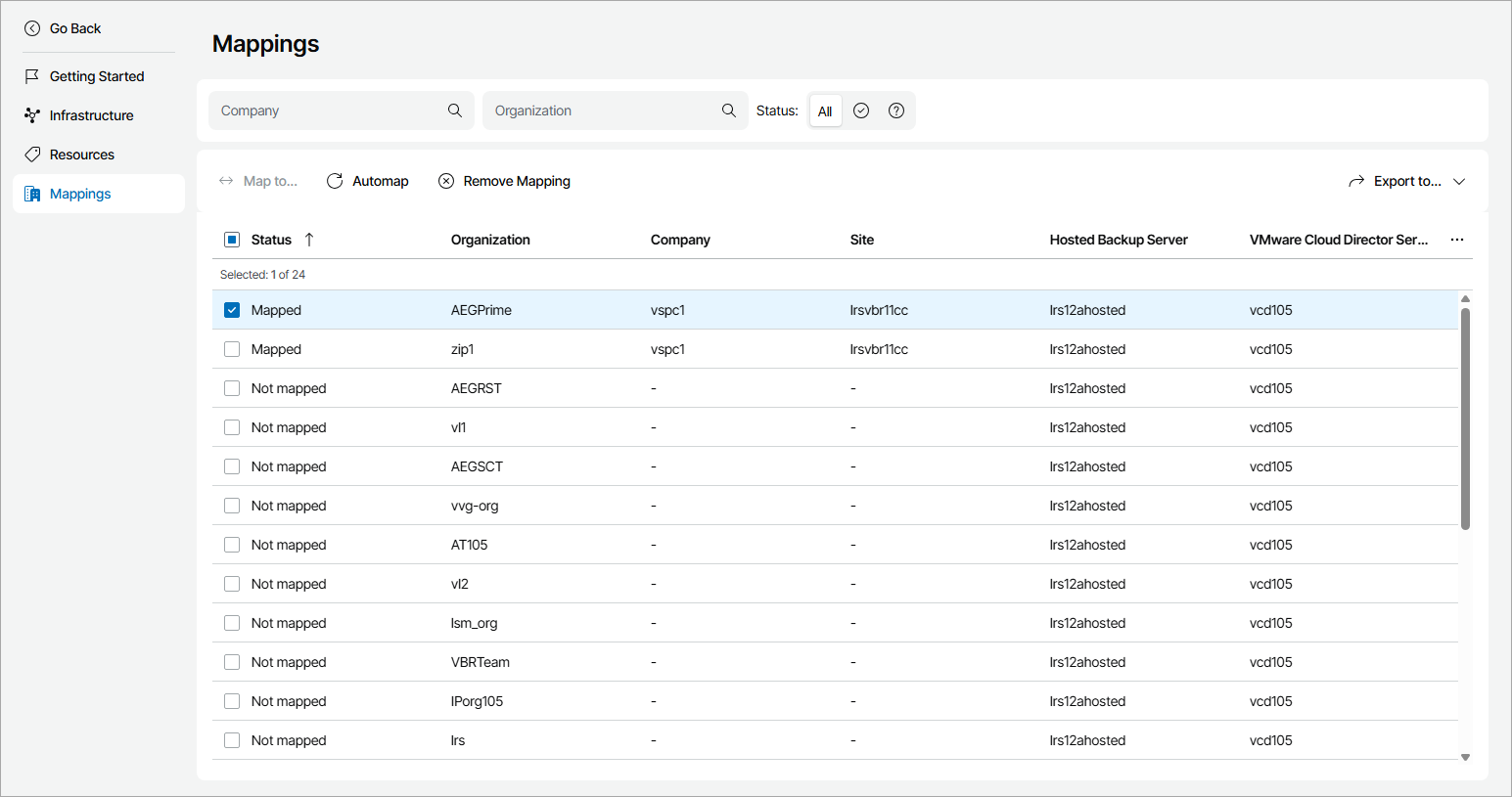 - Status — organization status (Mapped, Not mapped).