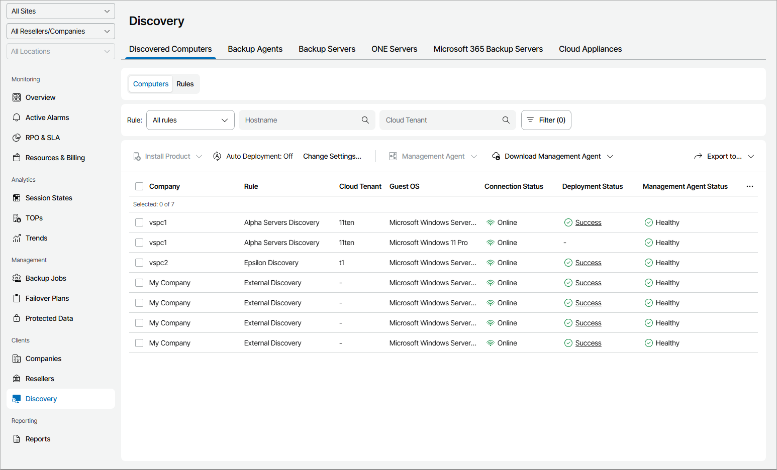 Choose External discovery to display computers that were not discovered with discovery rules, but rather with the help of Veeam Service Provider Console management agents running on these computers.