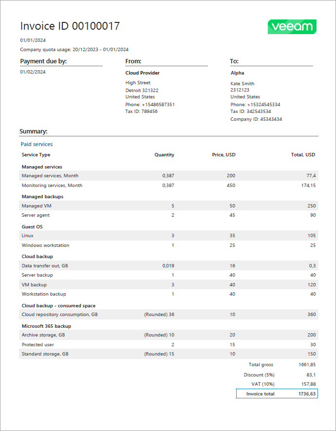 You can generate an invoice in the Veeam Service Provider Console to calculate the cost of services provided to a company. The invoice provides information about the cost of consumed services in accordance with a subscription plan assigned to a company.