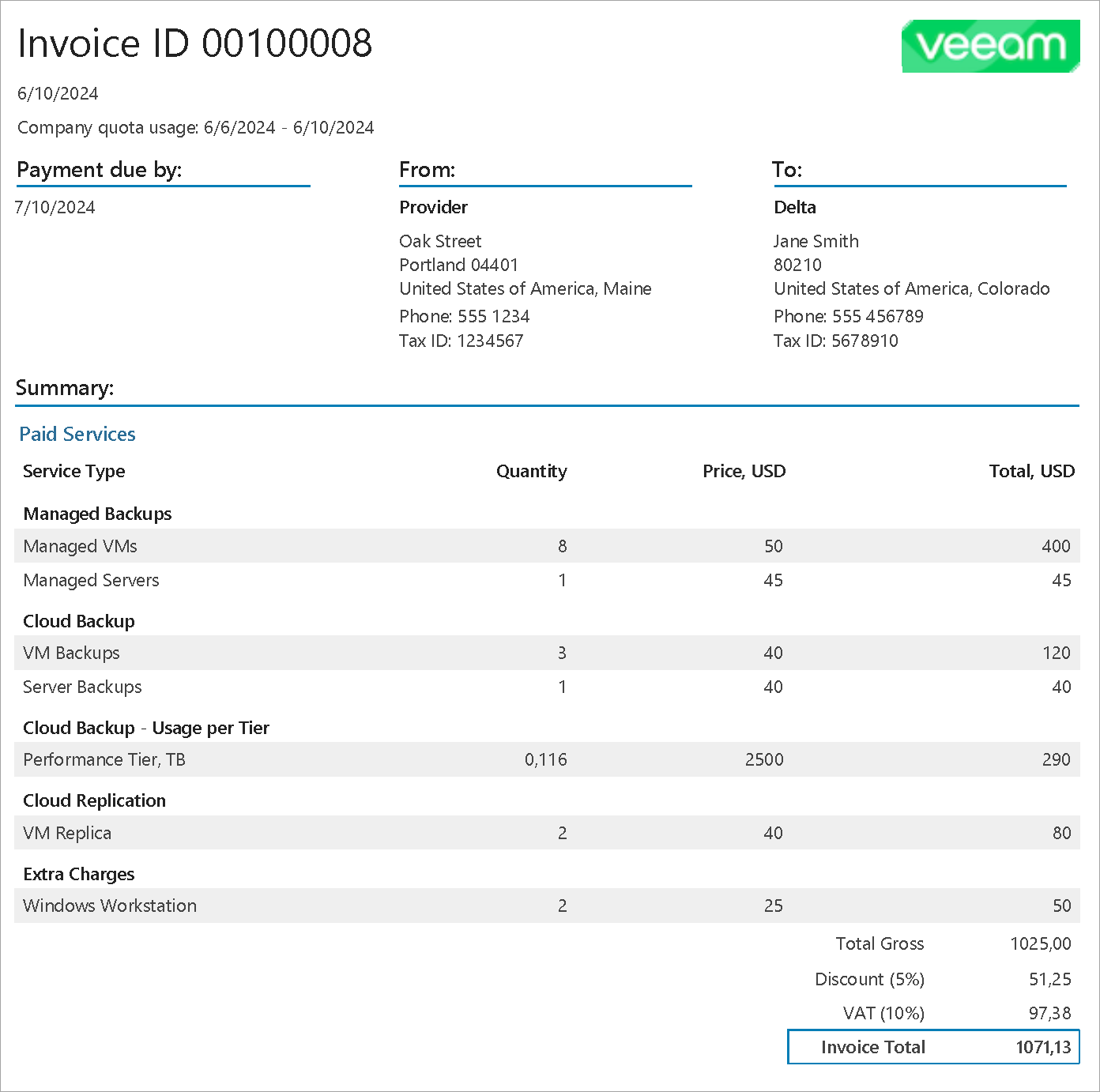 From the Veeam Service Provider Console, you can send an invoice to a client company by email. Invoices are sent as PDF files attached to billing notifications. You can also configure a schedule according to which invoices will be generated to automate invoicing.