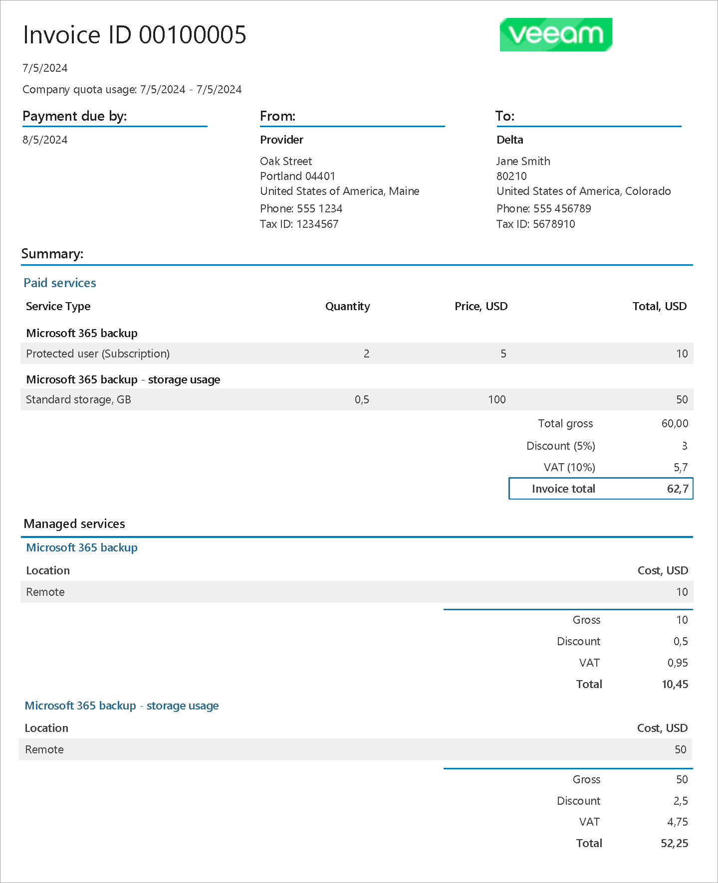 You can generate an invoice in the Veeam Service Provider Console to calculate the cost of services provided to a company. The invoice provides information about the cost of consumed services in accordance with a subscription plan assigned to a company.