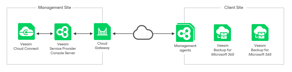 The management agent transmits commands from Veeam Service Provider Console to the Veeam Backup for Microsoft 365 server, performs management operations, collects data from Veeam Backup for Microsoft 365 and communicates it to Veeam Service Provider Console. You can deploy the management agent in the following ways: