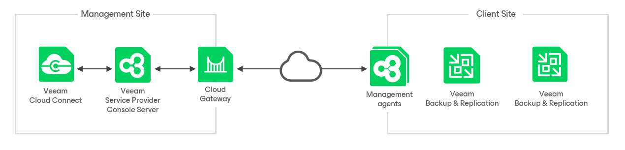 - The management site, where Veeam Service Provider Console is deployed and the Veeam Cloud Connect resources are hosted.