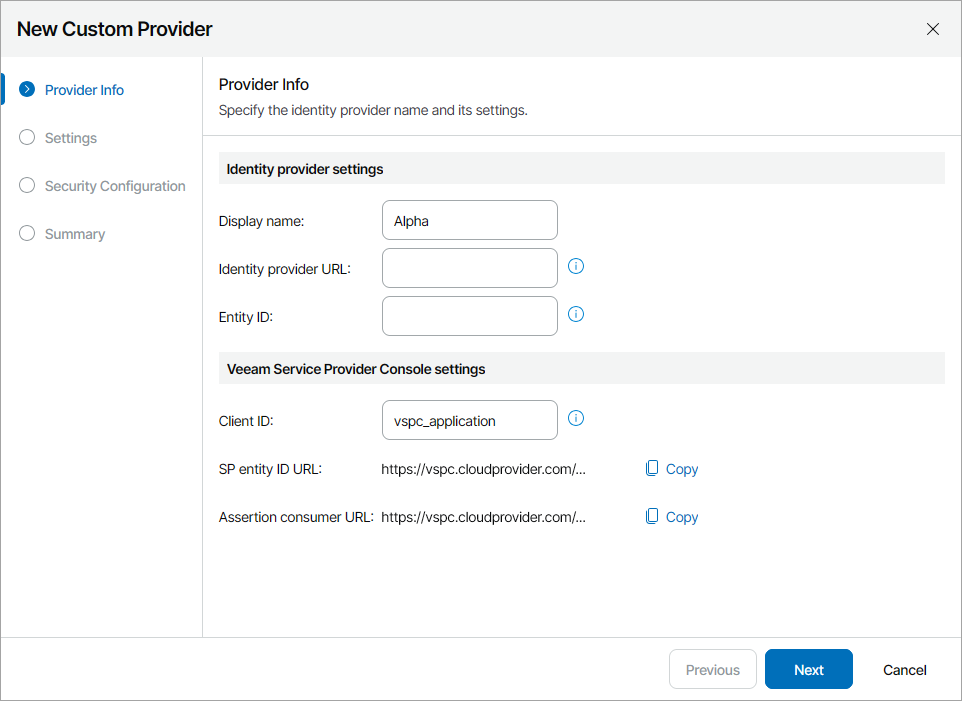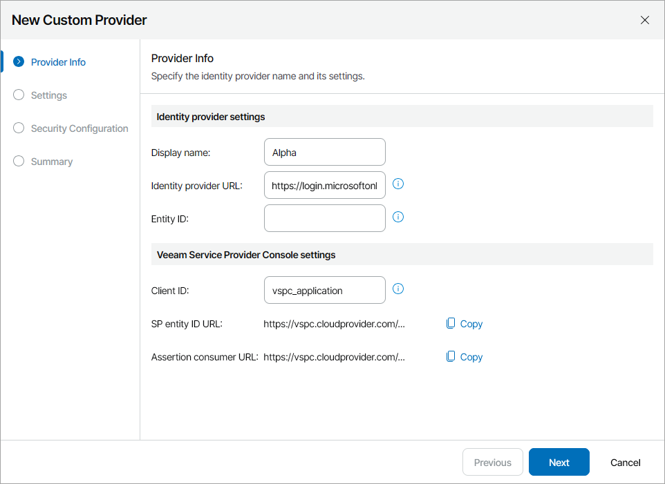 - In Veeam Service Provider Console, paste the link into the Entity ID field.