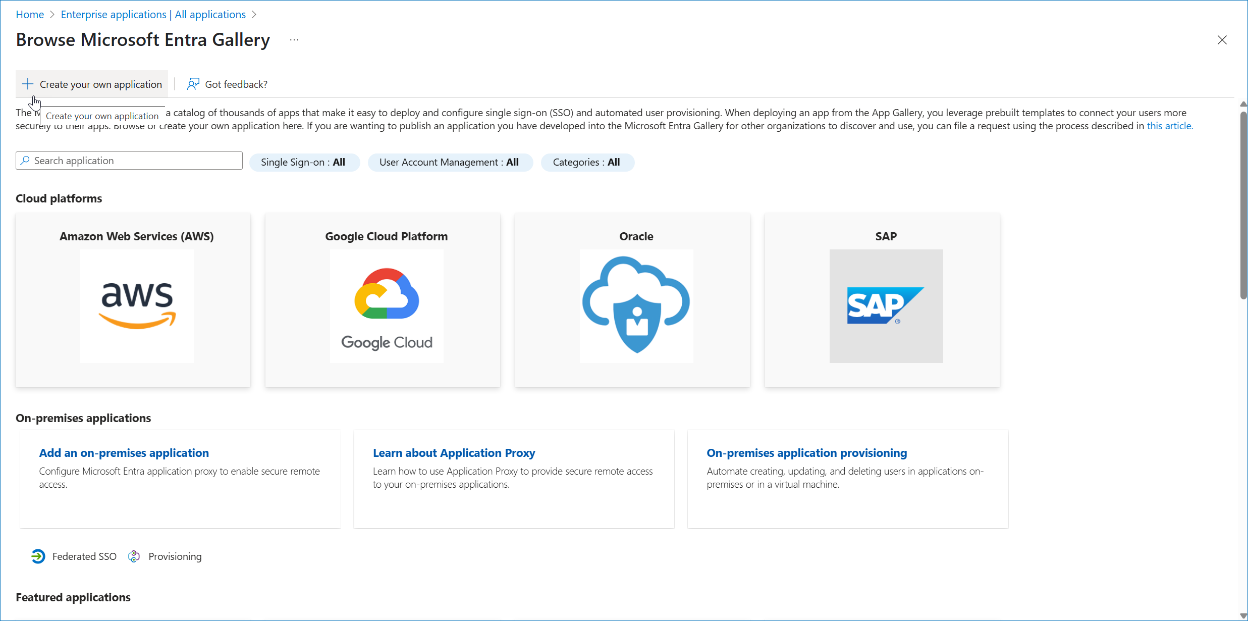 - In the Browse Microsoft Entra Gallery window, click Create your own application.