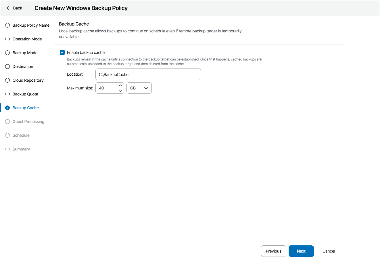 - In the Maximum size field, specify the size for the backup cache.