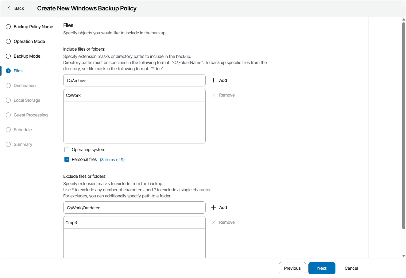 To include in the backup specific files or file types, you can specify file names and masks for file types that you want to back up. For example, MyMovie.avi,*filename*, *.docx, *.mp3. Veeam backup agent will create a backup only for selected files. Other files will not be backed up.