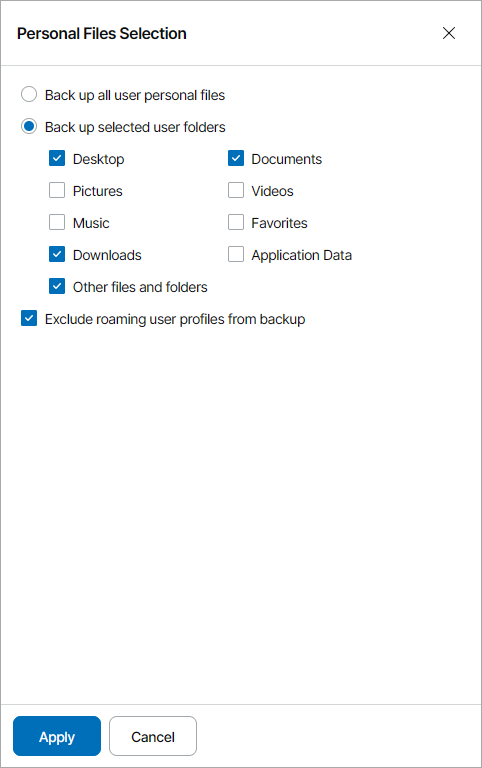 - Select the Personal files check box to include in the backup the user profile folders, including all user settings and data.