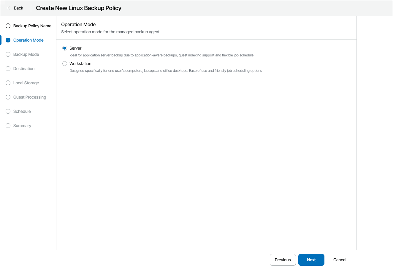 This mode supports application-aware processing, files indexing and flexible backup job schedule, and is designed to protect application servers.