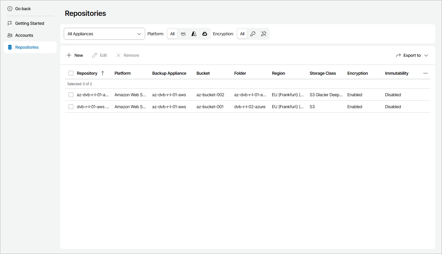 - Appliance — limit the list of repositories by appliance name.