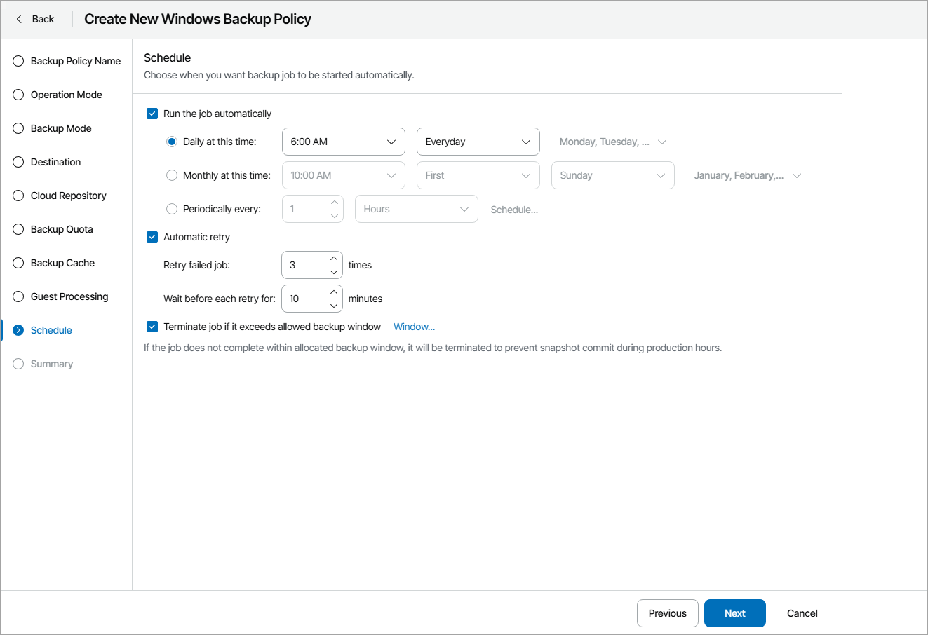 - Select the Terminate job if it exceeds allowed backup window check box and click Window.