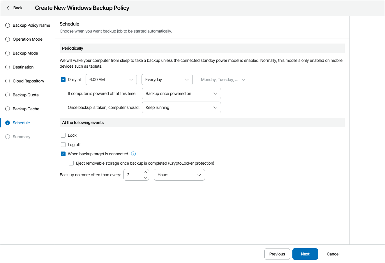 - Select the When backup target is connected check box if the scheduled backup job must start when the backup storage becomes available (for example, when the computer connects to a local network and the target shared folder is accessible).