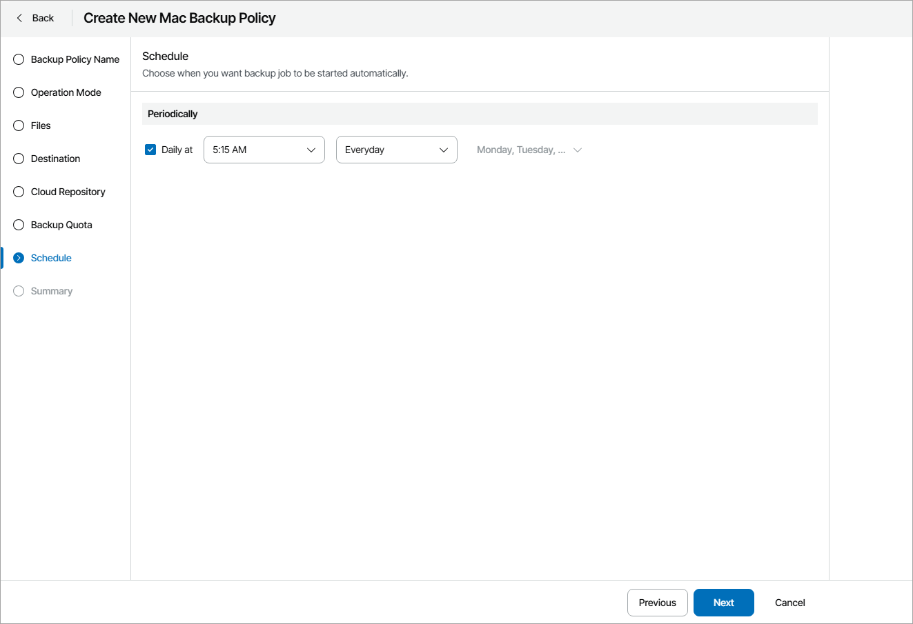 - Select the Daily at check box and use the fields on the right to specify time and days when the backup job must start:
