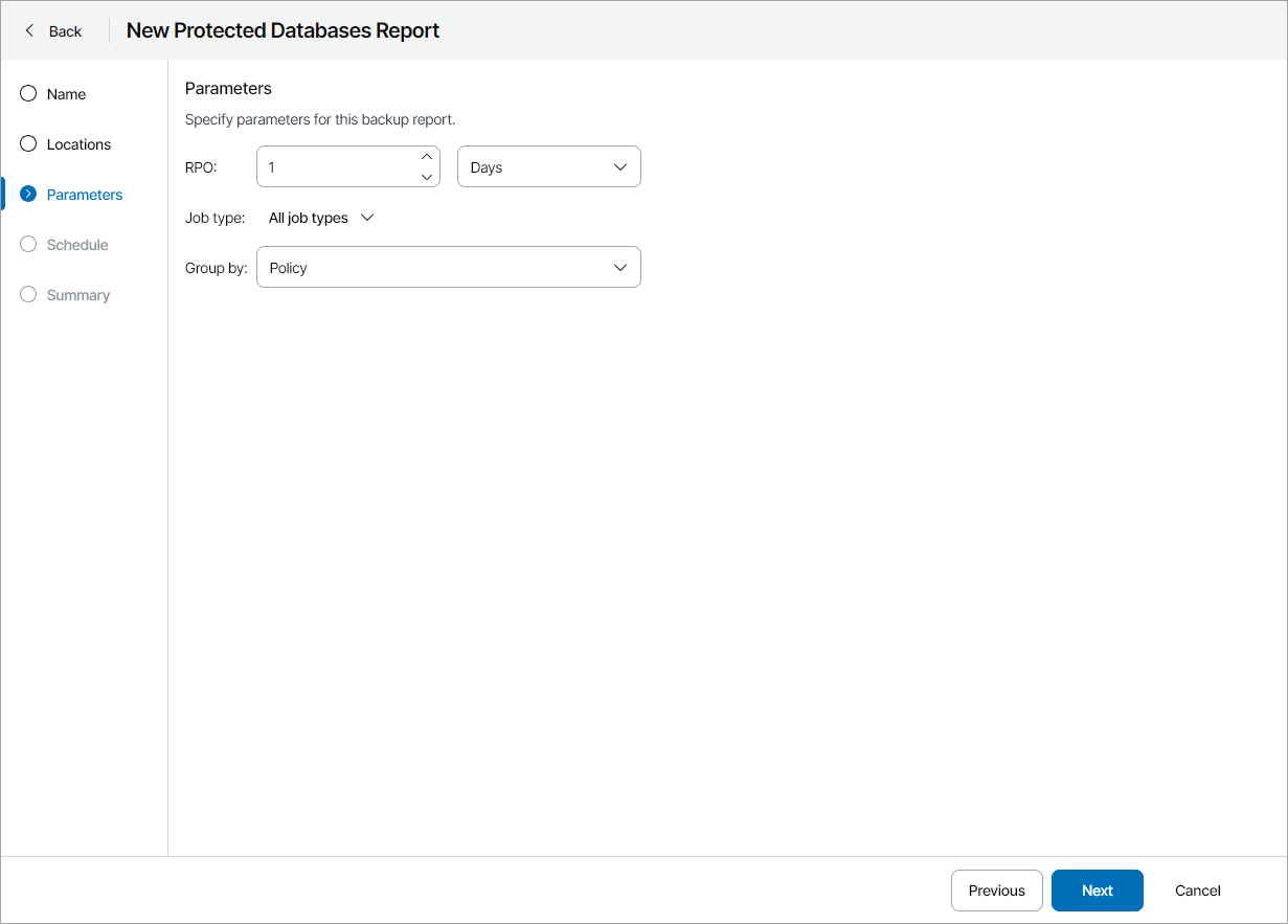 RPO defines a period between backup sessions, or, in other words, a period for which you can afford to lose data. For example, if protected databases must have daily backups, specify 1 day or 24 hours as the RPO value.