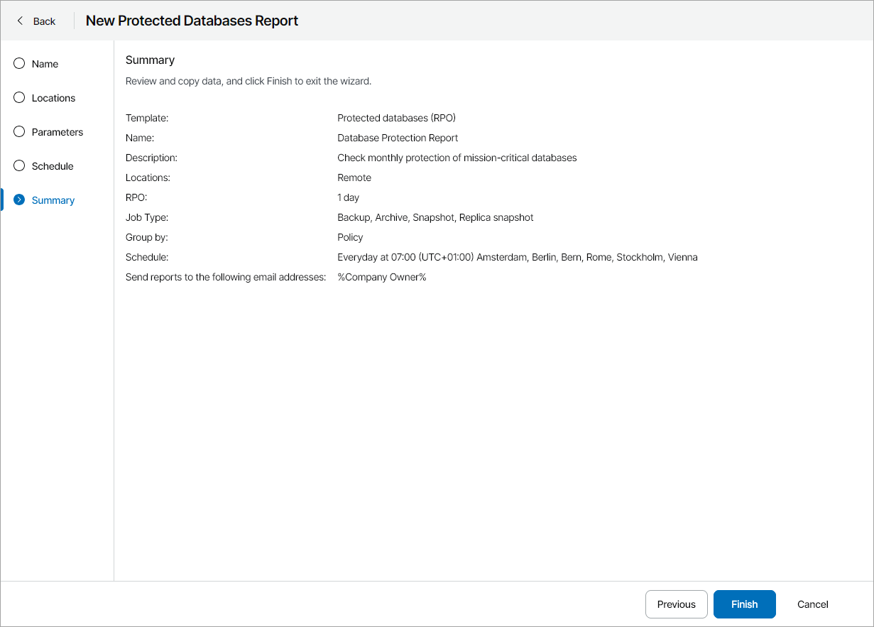 - At the Summary step of the wizard, review the report configuration and click Finish.