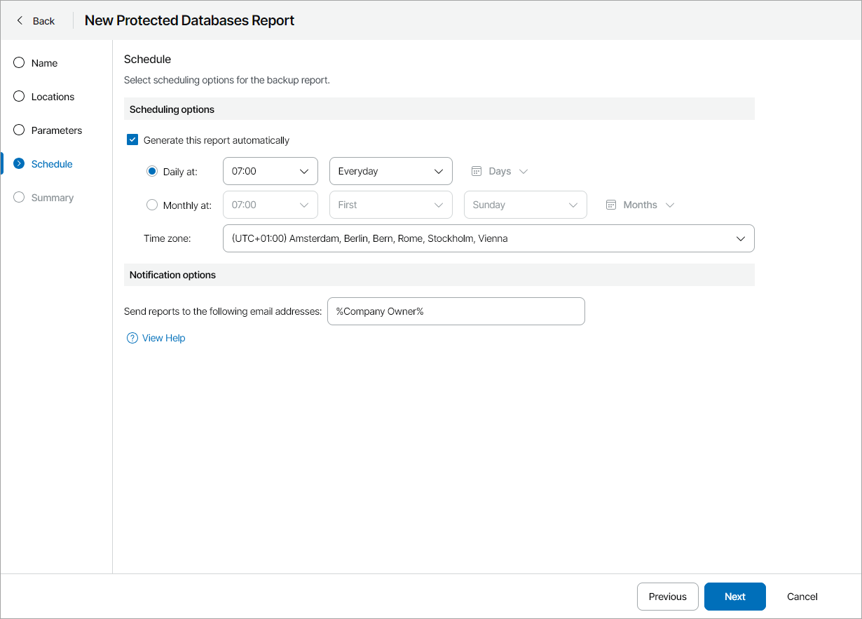 - At the Schedule step of the wizard, specify a schedule according to which the report must be generated: