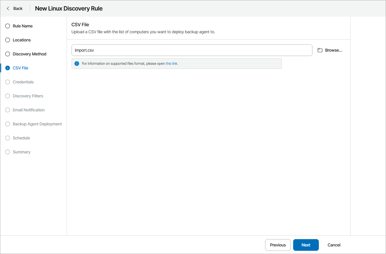 - At the CSV File step of the wizard, click Browse and specify a path to a CSV file that contains a list of IP addresses or DNS names of computers that must be scanned.