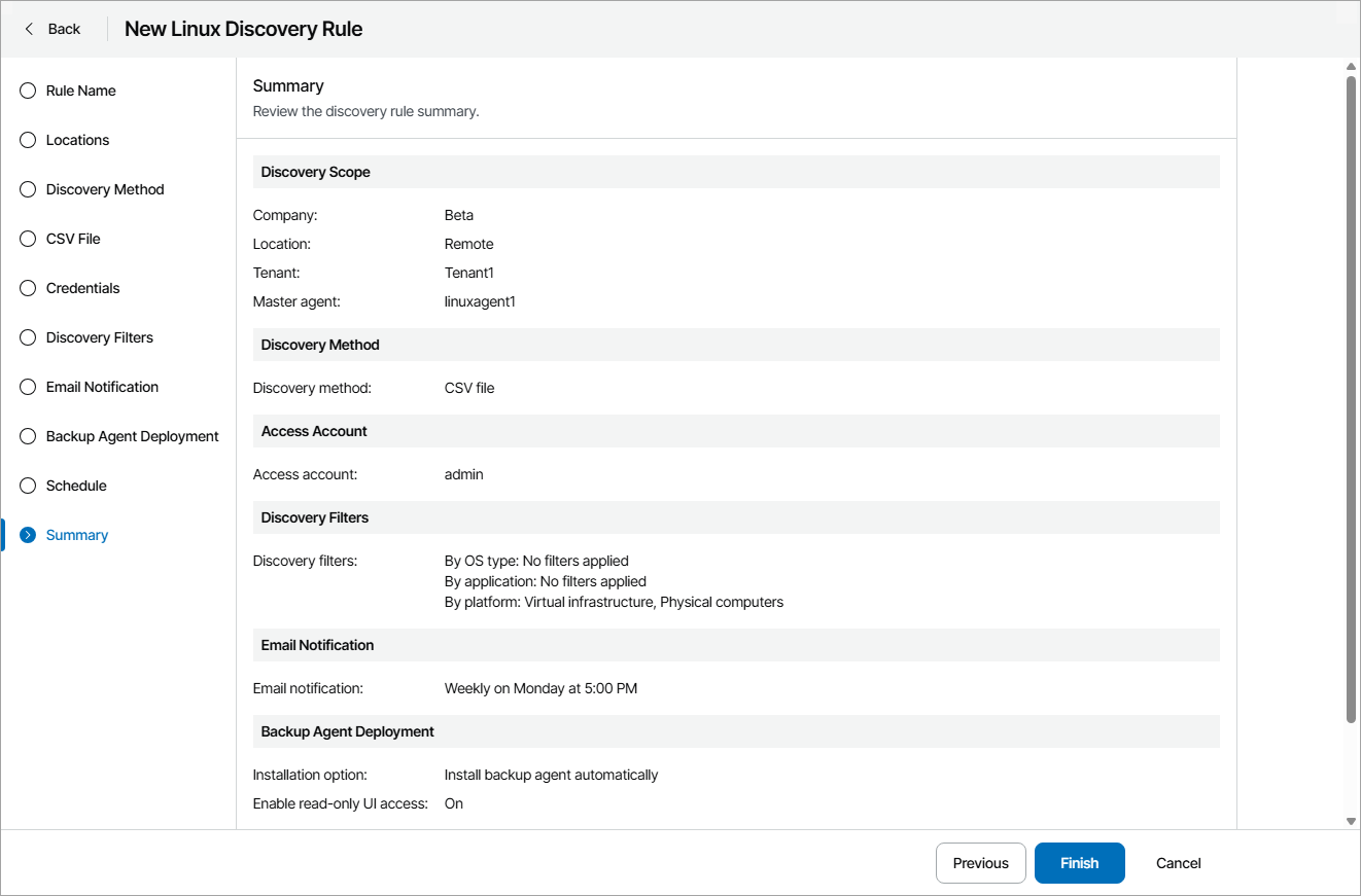 - At the Summary step of the wizard, review discovery rule settings and click Finish.