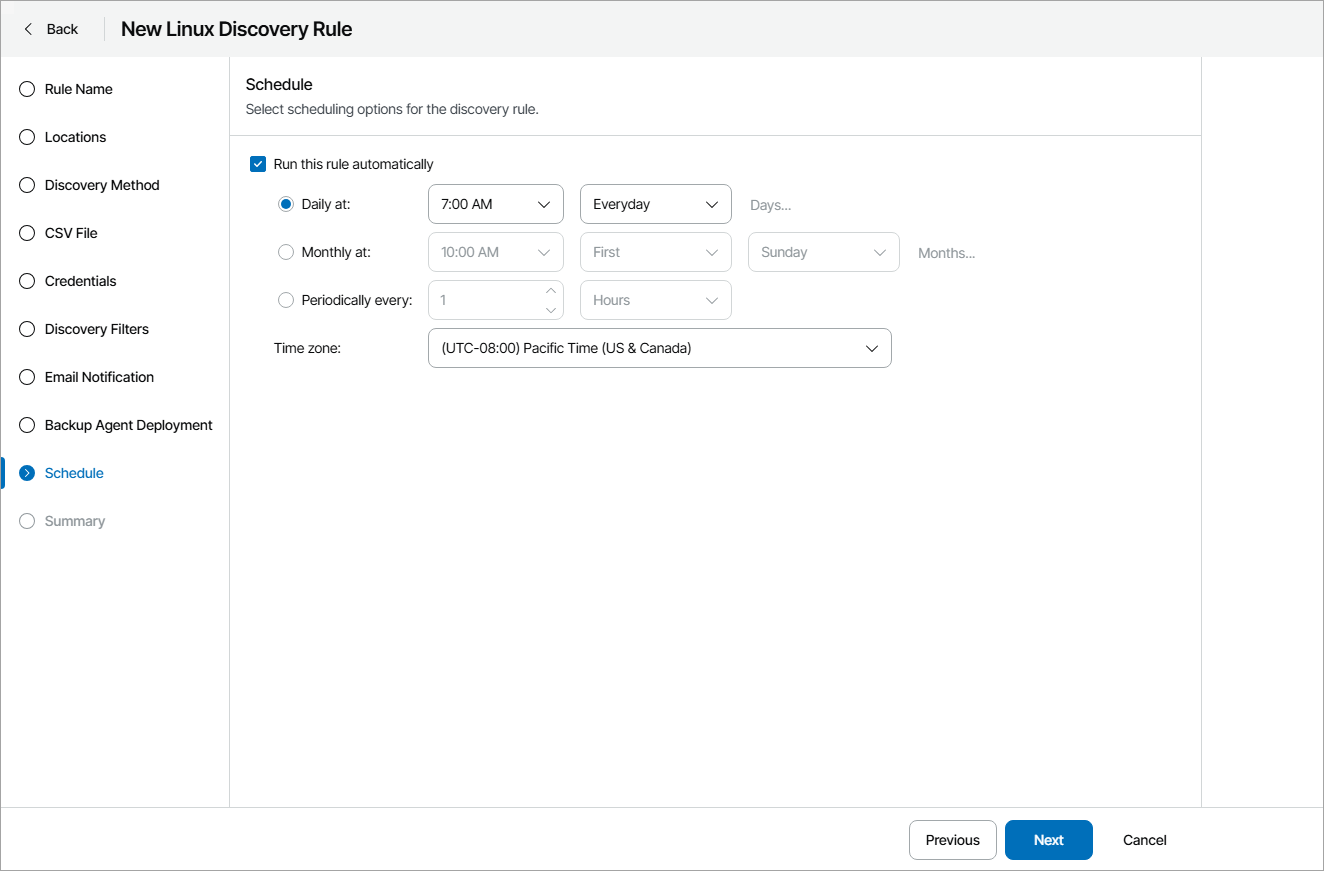 - At the Schedule step of the wizard, specify schedule according to which discovery must be performed: