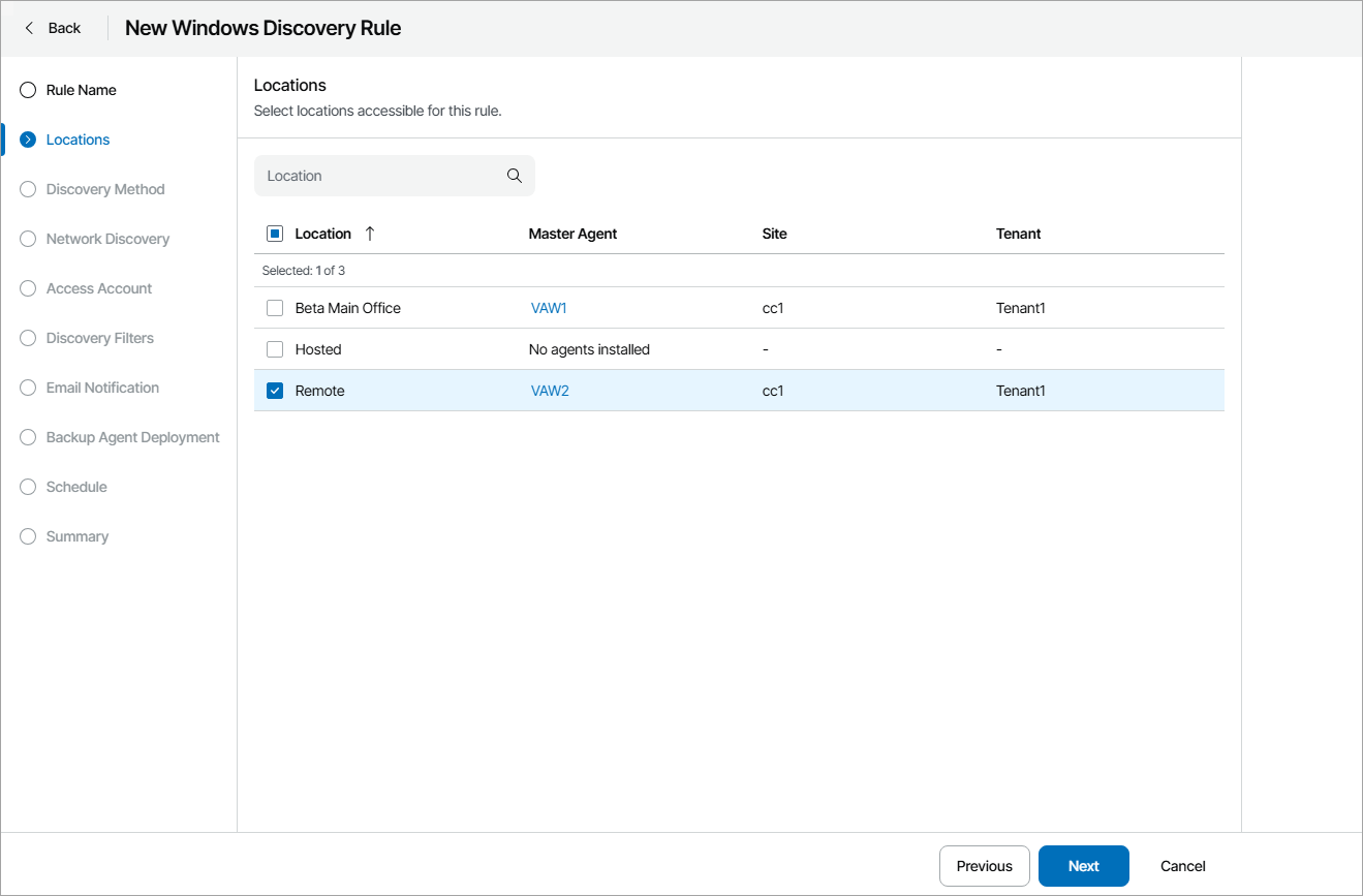 - At the Locations step of the wizard, click a link in the Master Agent column and select a management agent that will be used as the master agent for discovery in each company location.