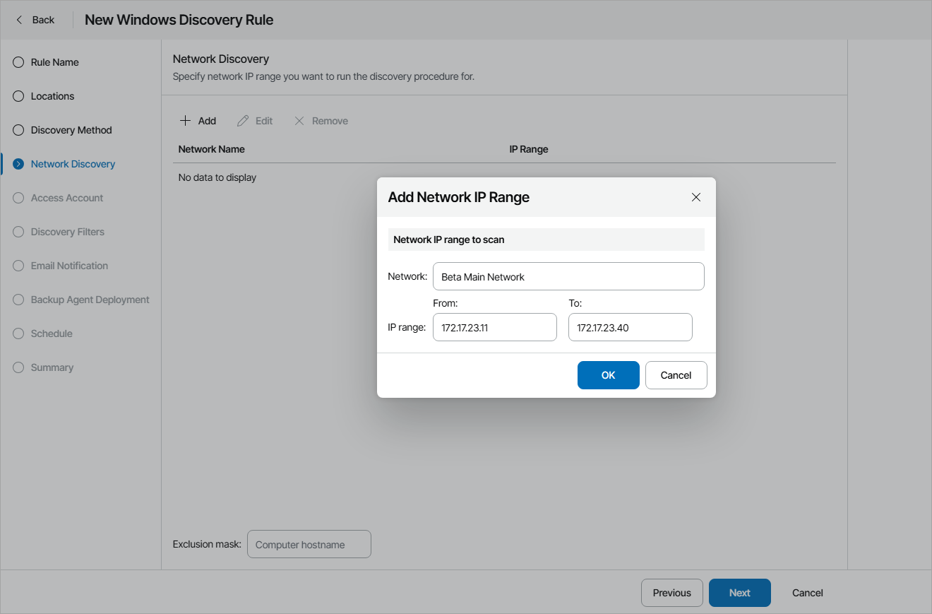 - At the Network Discovery step of the wizard, specify one or more networks and IP ranges that must be scanned to discover computers: