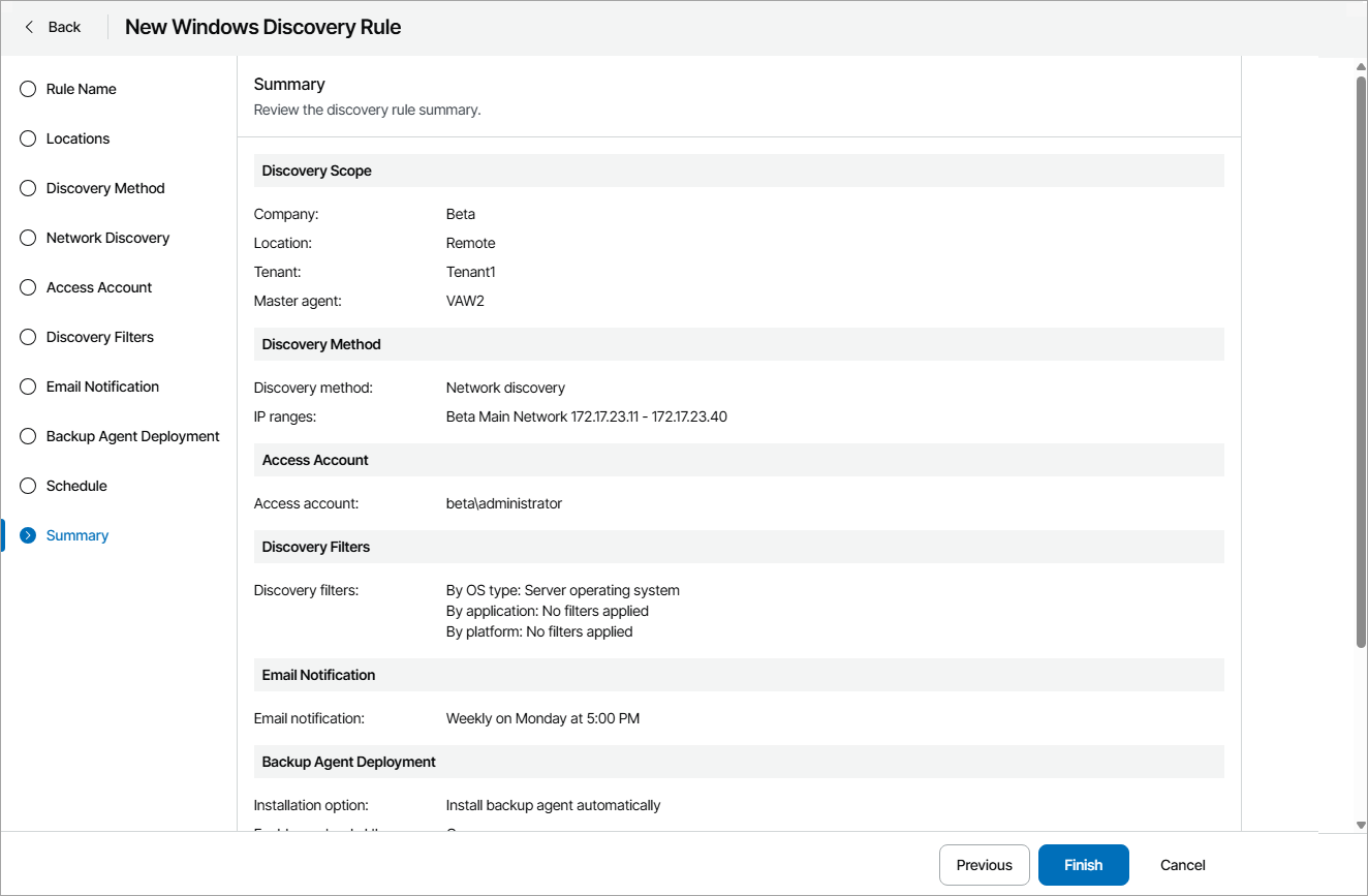 - At the Summary step of the wizard, review discovery rule settings and click Finish.