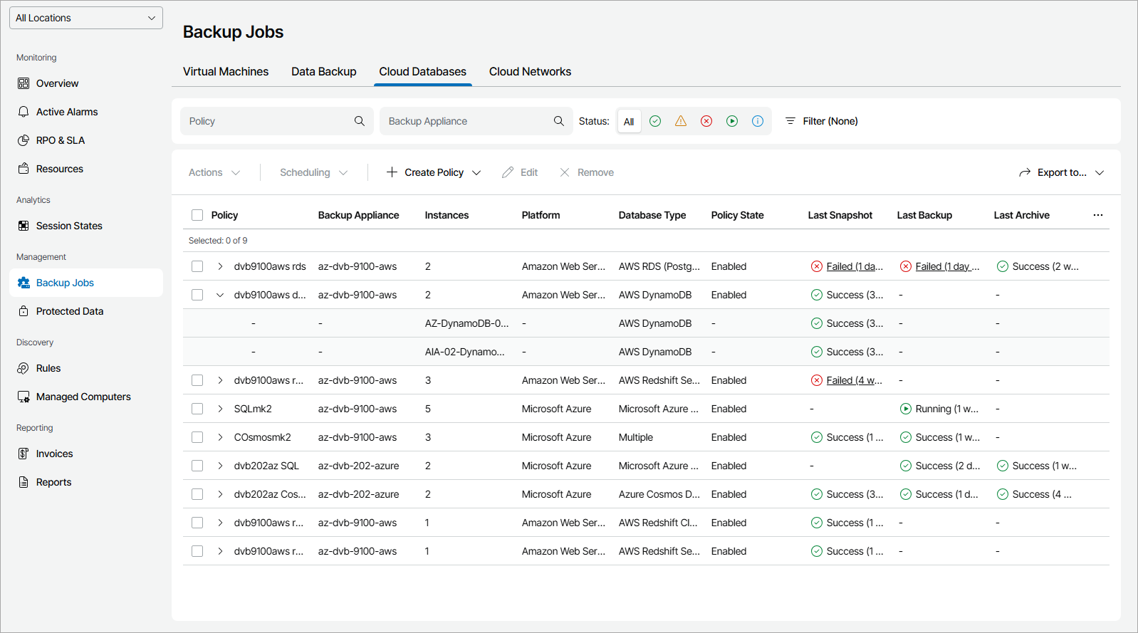 - Status — limit the list of policies by the result of the latest session (Success, Warning, Failed, Running, Information).