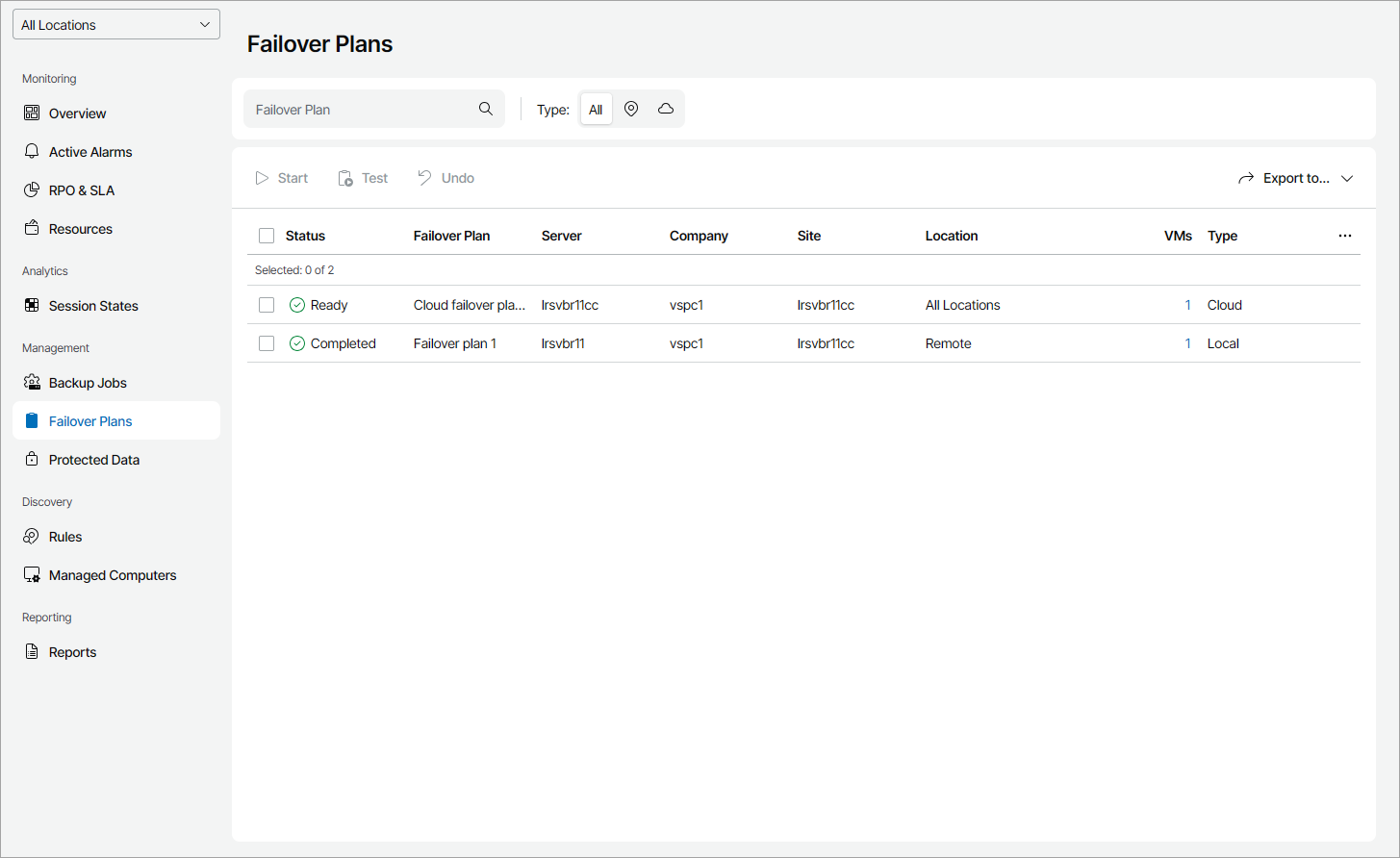 - Type — limit the list of failover plans by type (Local, Cloud).