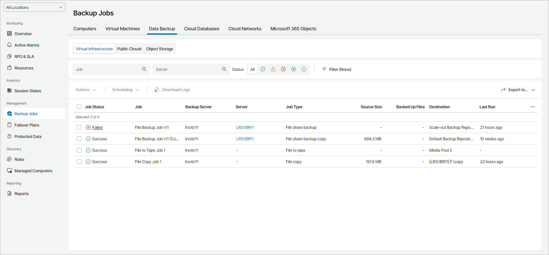 - Job Type — type of a file protection job (File share backup, File share backup copy, File copy, File to tape).