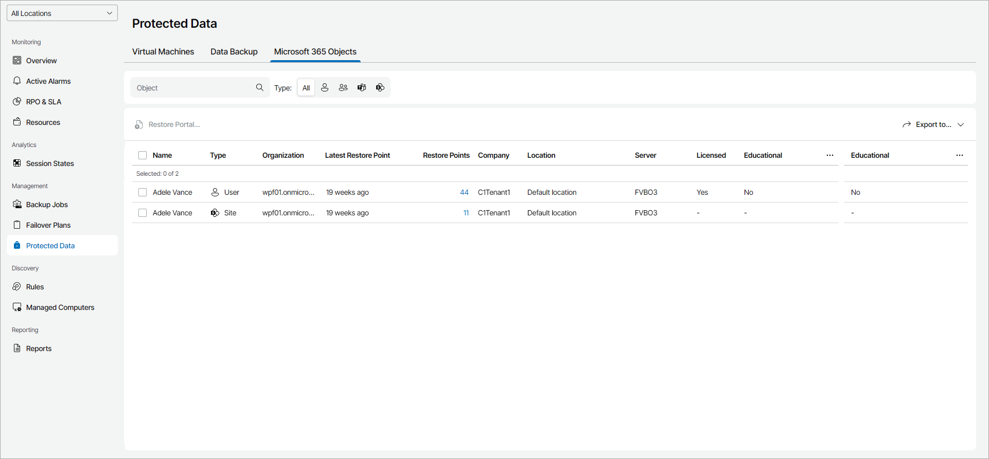 Veeam Service Provider Console will display a list of all objects protected by managed Veeam Backup for Microsoft 365.