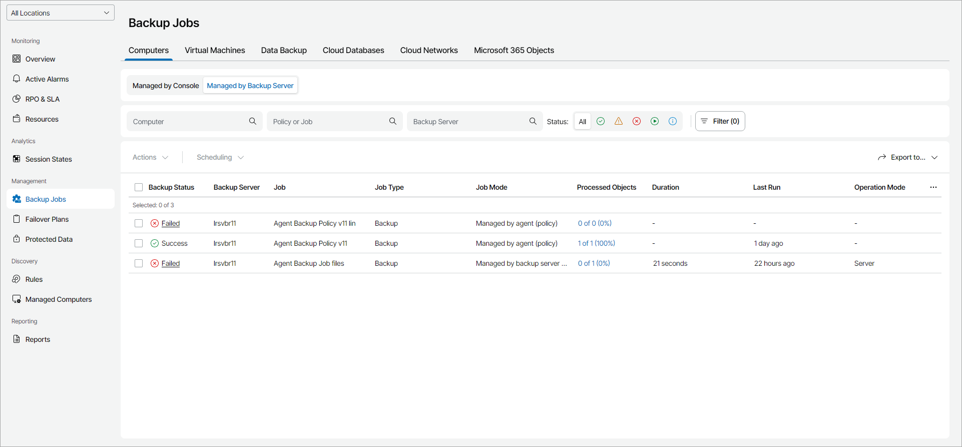 - Backup Status — status of the latest job session (Success, Warning, Failed, Running).