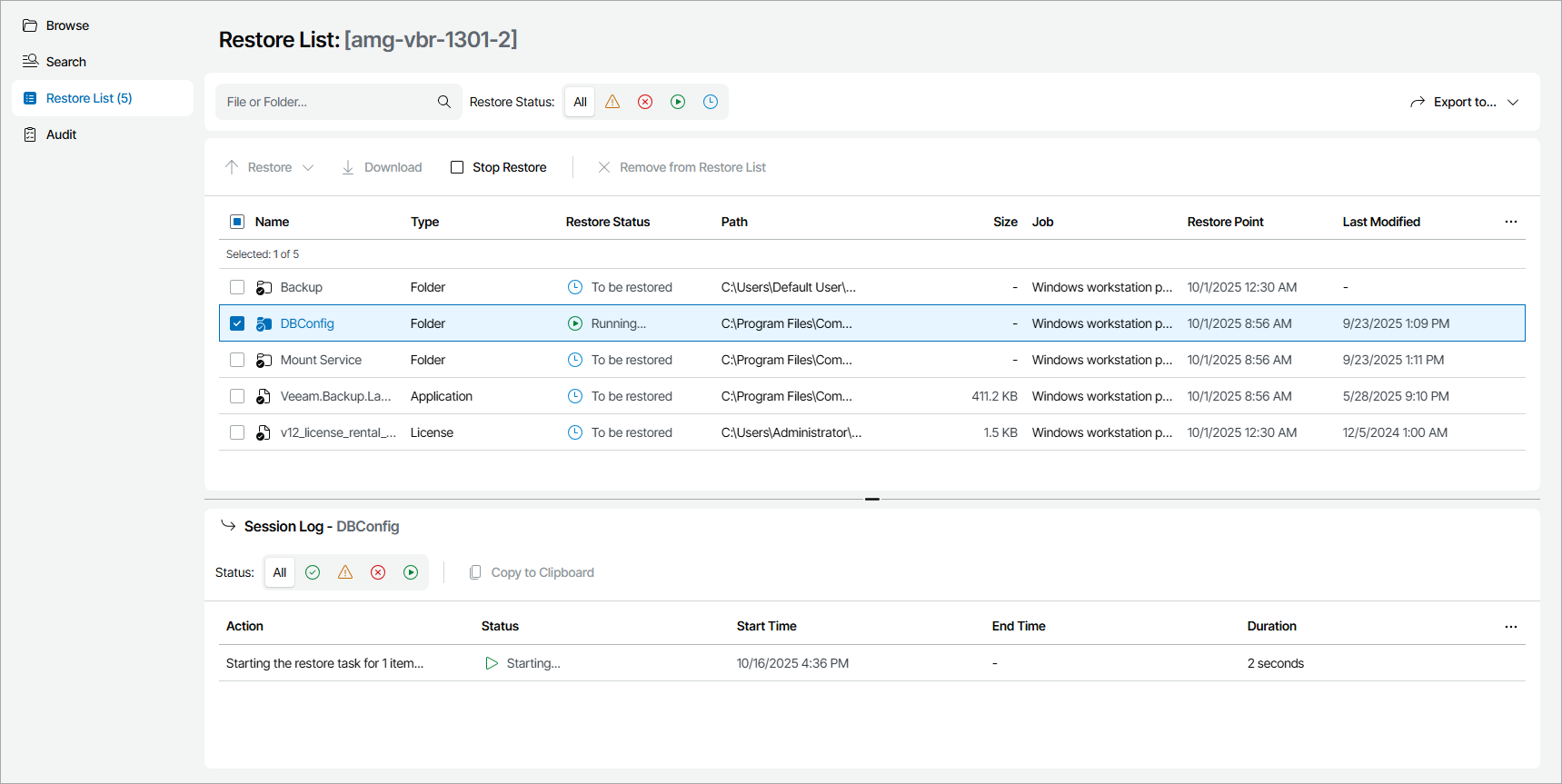Veeam Service Provider Console will start the selected restore session. After you start restore, you can view restore session details in the Session Log section.