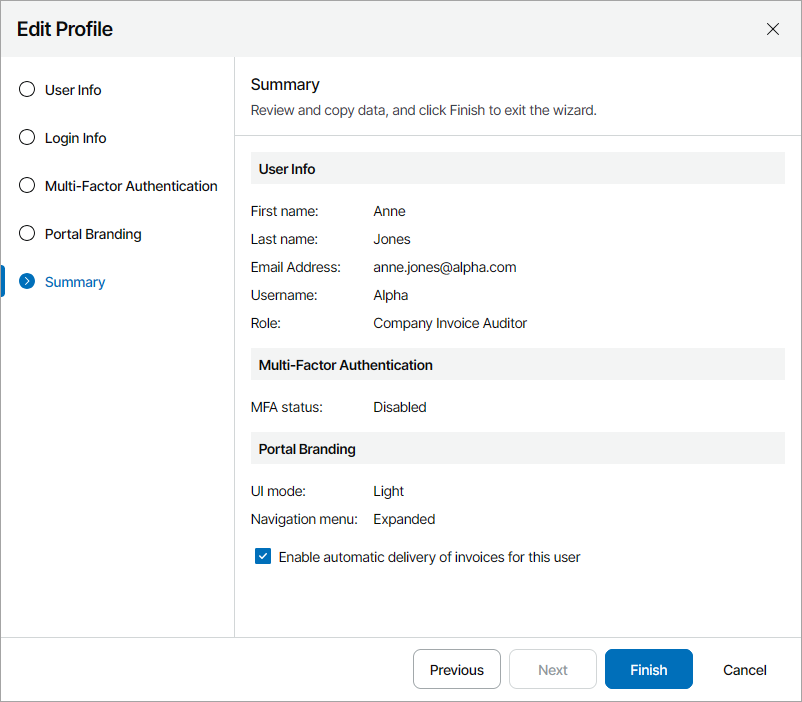 [For Company Owner, Company Invoice Auditor] Select the Enable automatic delivery of invoices for this user check box if you want to receive a billing notification by email each time when a new invoice for the company is generated and sent. For details, see Receiving Billing Notifications.