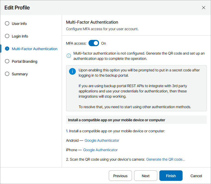 - Set the MFA access toggle to On and click the Generate the QR code link.