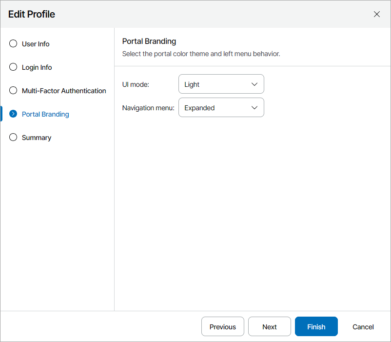 - From the UI mode drop-down list, select the portal color theme (Light, Dark, System).