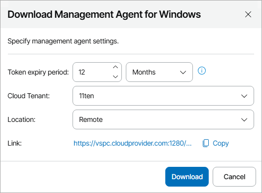Veeam Service Provider Console will generate a download link for the management agent.